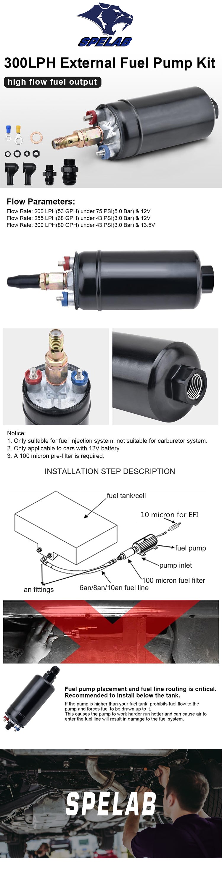 Notice: fuel pump only fit 12-volt DC batteries car. This fuel pump is intended for electronic fuel injection systems only. It is not suitable for carbureted engines. Before starting the engine, ensure there are no leaks at any point in the fuel system. Before wiring the pump to the electrical system make sure the polarity is correct.