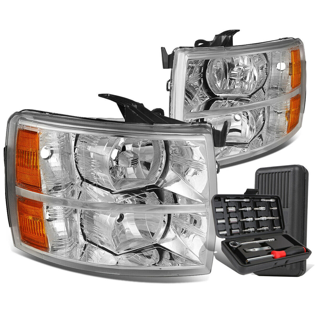 2007-2014 Chevy Silverado Pair Chrome/Amber Signal Headlight Lamps+Tool Box