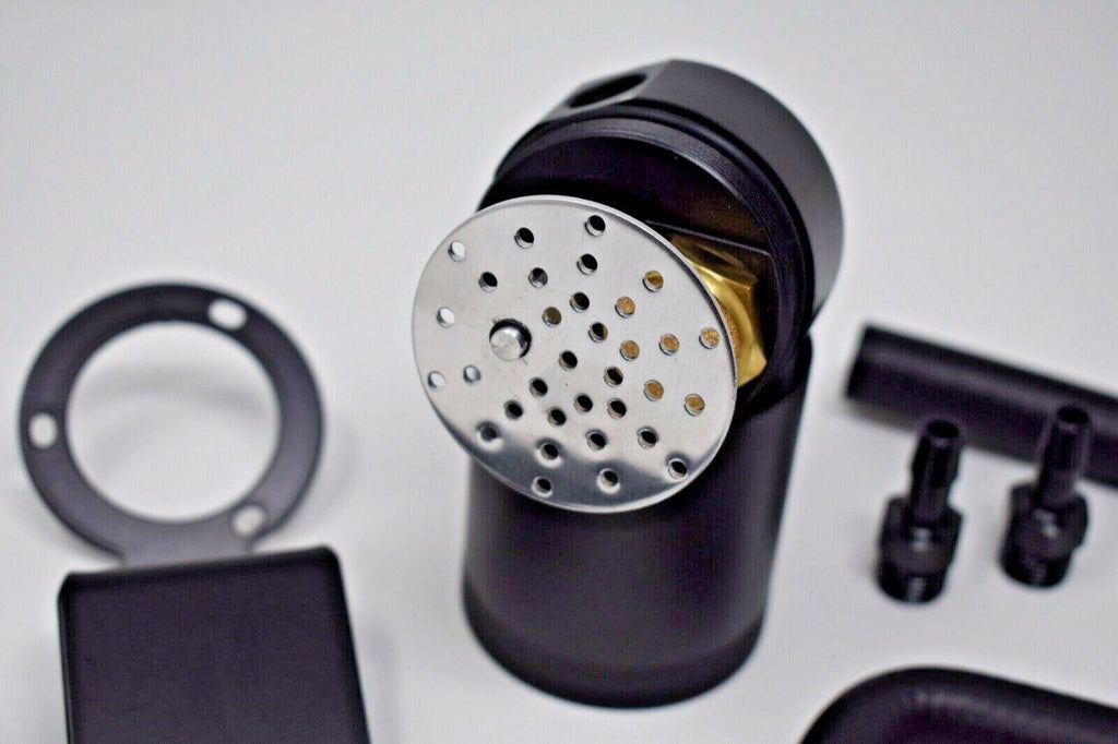 Over time harmful oil will build up inside the turbocharger, intake manifold, intercooler, and piping. Our oil catch can prevent this from happening while its all-black finish will add a touch of style to your engine bay.