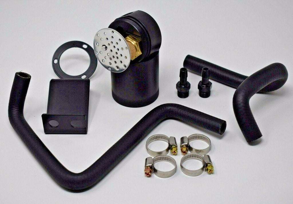 • Single 2-Port Compact Baffled Oil Catch Can mount in line with the PCV system to separate oil particles using a 50-micron bronze filter