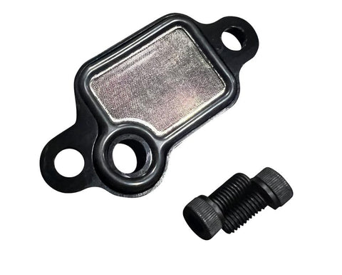 This high-quality billet aluminum K Series VTC oil filter baffle strainer assembly is a direct bolt-on replacement for the OEM plastic unit. It is constructed from lightweight and durable 8620 billet aluminum and hard anodized black for style and strength. This assembly includes a new gasket screen and mounting hardware.