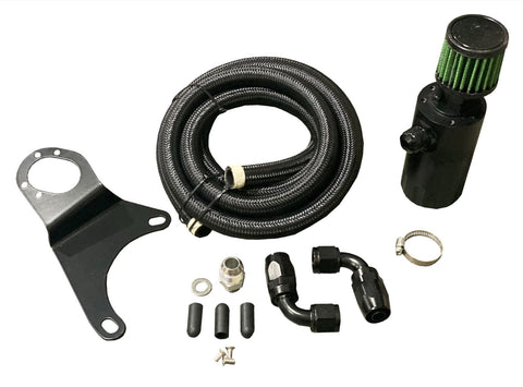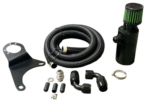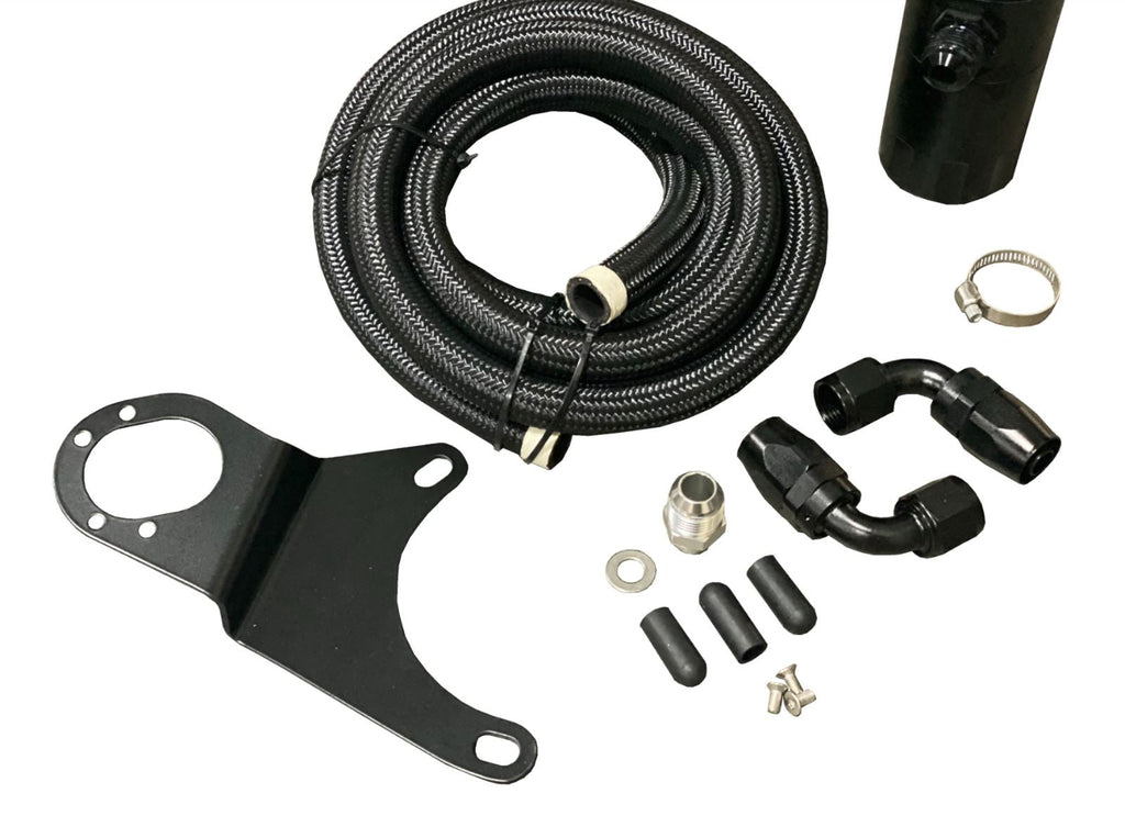 This VTA kit is intended to be used by itself as the only crankcase vent point. It replaces the stock PCV hose and OEM PCV valve with a -10AN valve cover fitting and 10AN braided hose and allows the gasses to vent through the catch can to the atmosphere. This kit installs on the LH strut tower.