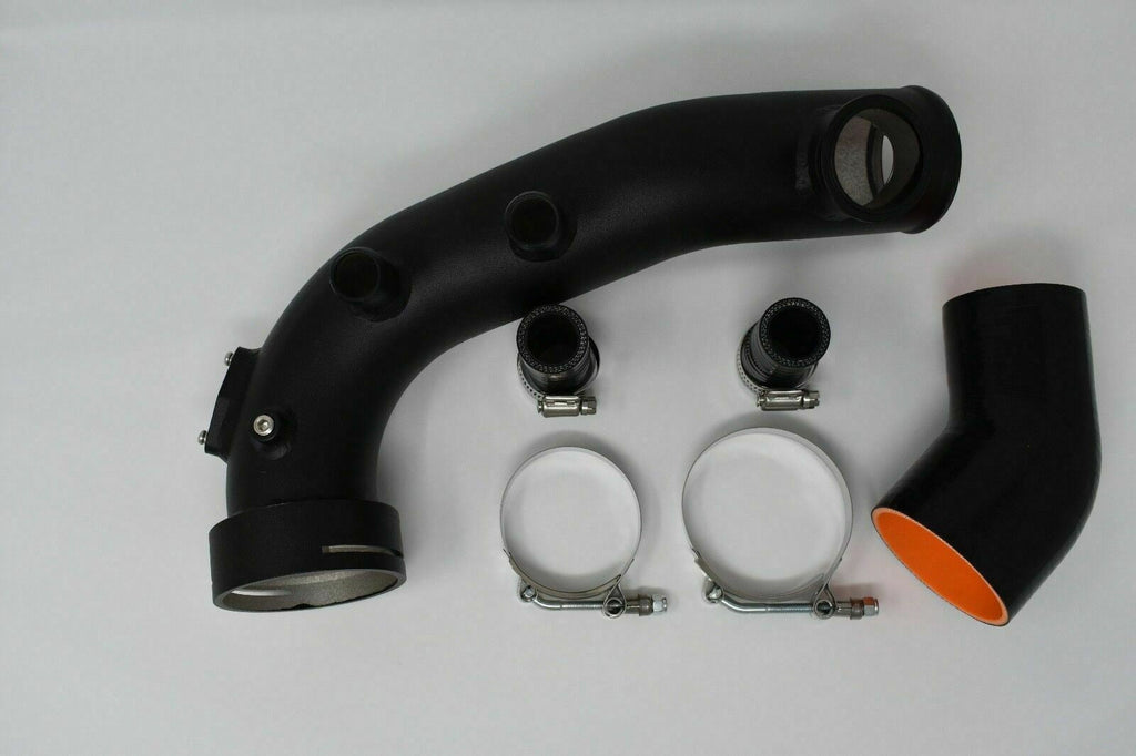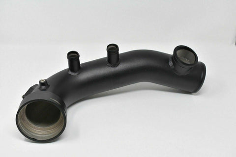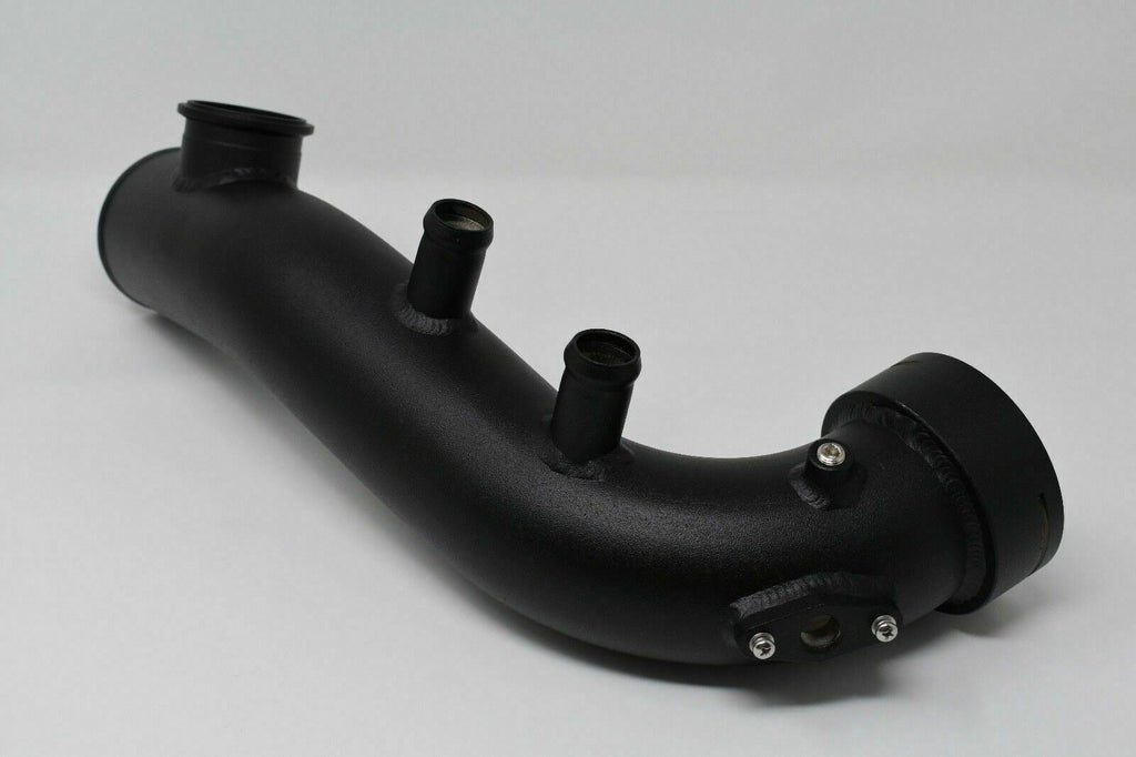The N54/N55 aluminum replacement chargepipe is a great high quality low cost upgrade to your flimsy factory plastic chargepipe. The piping is 3" throughout preventing any possible flow restriction, the throttle body flange is CNC machined for a factory fit, and the aluminum piping powder coated black for a great looking and long lasting finish. Each pipe includes dual 1/8" NPT bungs, high pressure t-bolt clamps, and all hardware required for installation. This is simply the best value for stronger N54/N55 chargepipes out there. E chassis N54 and N55 only. Does not fit F chassis N55. Comes with TiAL Replica BOV and ALL Hardware necessary for installation.