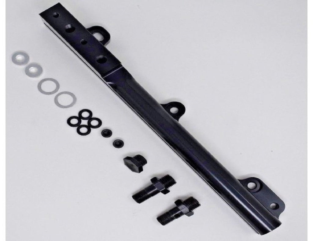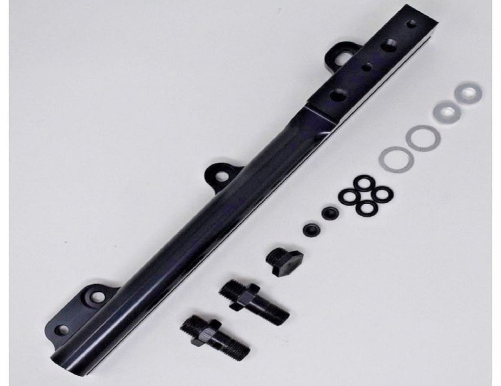 - A custom fuel line fitting is included for the factory fuel line and the ends of each rail are tapped to accept -6 AN or 9/16" x 18 fittings for users who want to use custom fuel lines.
