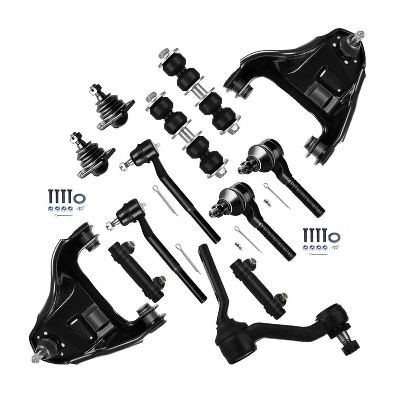 1.Specifications:(2)ES3584 Front Inner Tie Rod End,(2)K5335 Front Lower Ball Joint,(2)ES3462 Front Outer Tie Rod End,(2)K6600 Front Sway Bar End Link,(1)K620172 Front Upper Control Arm And Ball Joint - Driver Side,(1)K620173 Front Upper Control Arm And Ball Joint - Passenger Side,(1)K6251T Idler Arm,(1)K6255 Pitman Arm,(2)ES2004S Tie Rod Adjusting Sleeve