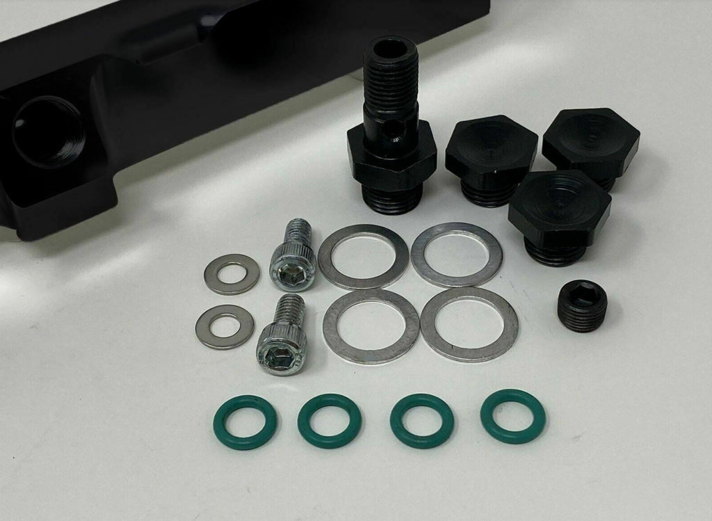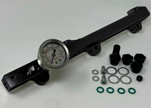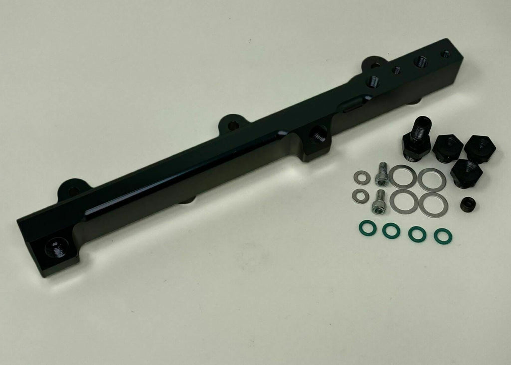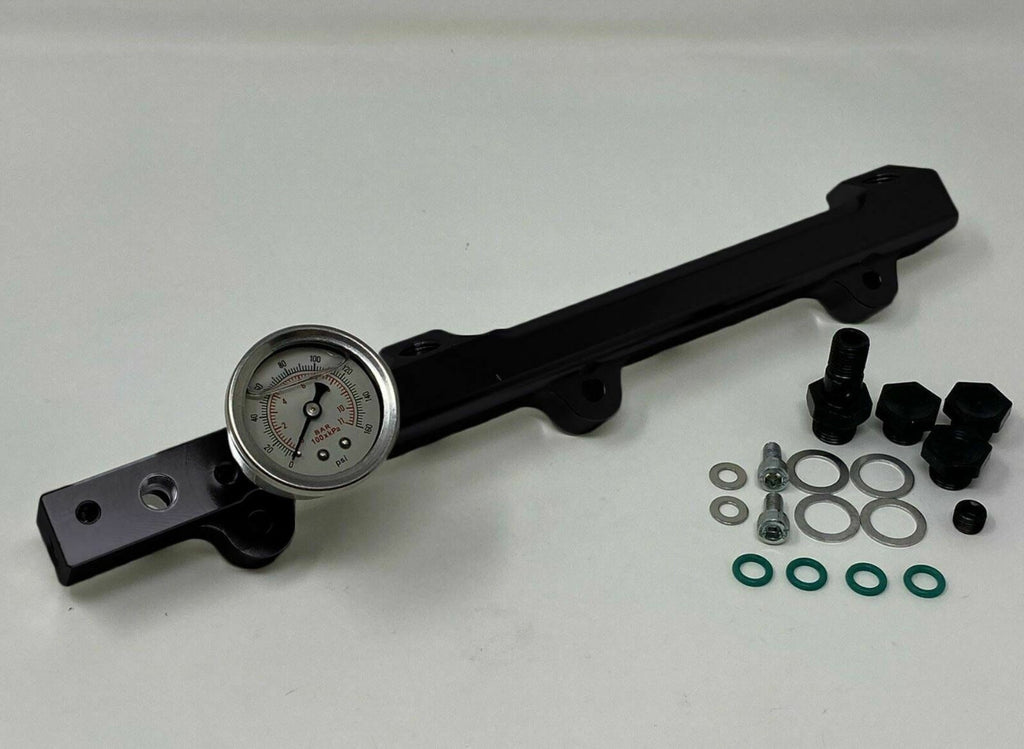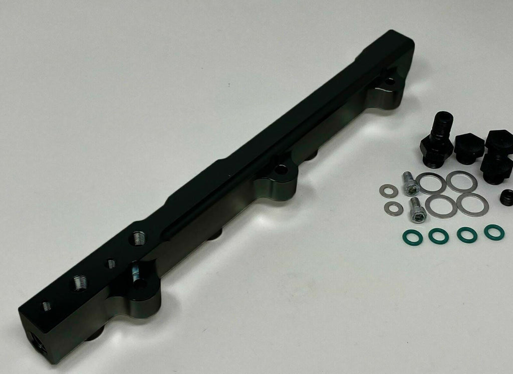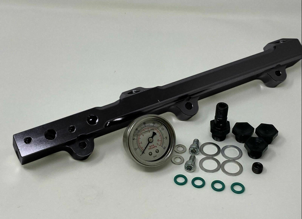 Our MadDogPerformance High Volume fuel rails feature a 1/2-inch fuel bore to support fuel flow for applications up to 1,000 horsepower. This large bore also dampens backpressure pulses created by larger injectors and works perfectly with stock injector sizes. An additional 1/8th NPT port is included to accommodate a nitrous set up or fuel pressure gauge. A custom fuel line fitting is included for the factory fuel line, and the ends of each rail are pre tapped to accept -6 AN or 9/16”x18 fittings for users who want to use custom fuel lines.