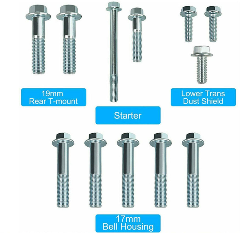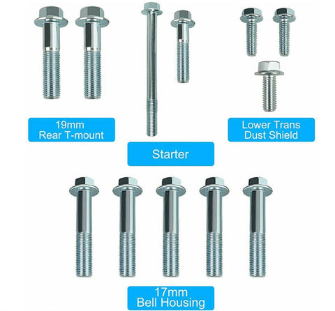 For sale is a complete Honda OEM bolt kit to bolt together a Honda/Acura. B Series by dro transmission to a B series engine block. Comes with bell housing bolts, T mount bolts, starter bolts, trans bracket bolts, and dust shield bolts.