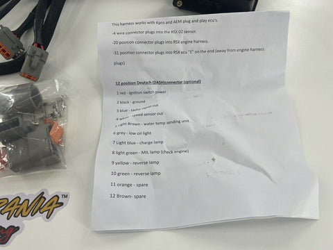 This race adapter harness is the perfect solution for any race car running the engine only. This harness comes with 5 relays and fuses to easily get our K-Swap Engine Harness (or OEM 02-04 RSX/EP3 harness) running in any car. Comes with flying lead connections for the Fan, Fuel Pump, and Flying lead harness for optional gauge cluster functions. Easy to install simply run the wires out to the designated points in the installation instructions and start it right up!