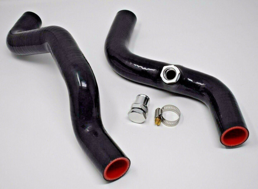 Our MadDogPerformance lower hose has been redesigned with a built in port to hold an optional bung for an OEM rad fan switch. This optional port was added so that you no longer need to cut into the hose to install a bulky and ugly aluminum adapter. If you don't plan to use a fan switch in the hose location, the included plug will seal the port easily. The plug can also be drilled and tapped for aux. coolant sensors if desired. Note that we still recommend installing the single wire coolant temp gauge sensor in the upper rad hose location. Made from high quality 4-ply silicone, these are designed to work with most 92-00 half size radiators that are relocated to the driver side of the engine bay. These will work with all PRB, PRC and RBC/RRC intake manifolds. No more installation headaches or messing around with universal hoses.