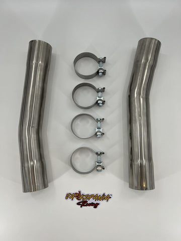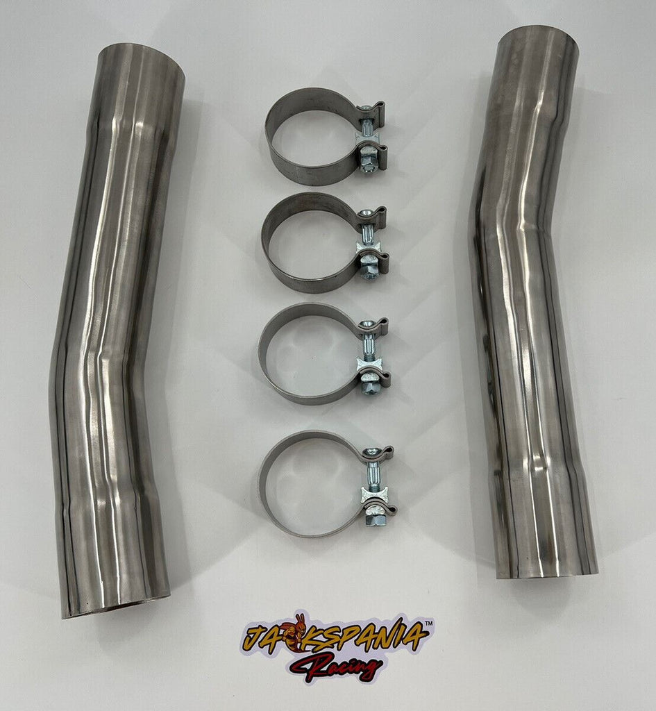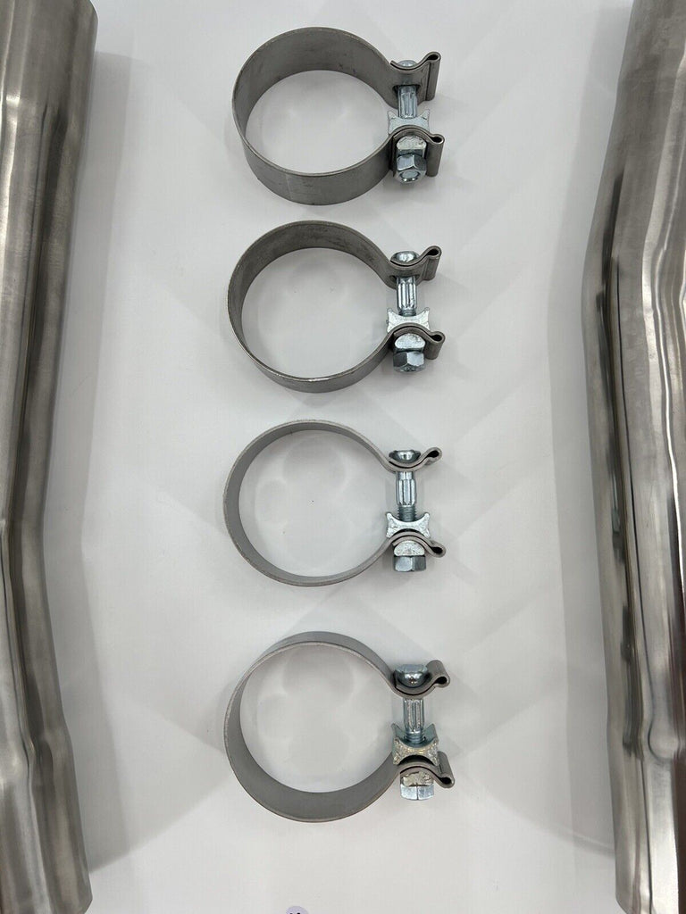 This listing is for 2 mandrel bent pipes and clamps to replace your mid mufflers. Just cut out that suitcase and clamp these in. The great thing about removing the mid mufflers is there is very little drone inside the vehicle. Due to Dodge putting an odd sized exhaust diameter on their vehicles, this is a 2.75" OD pipe with both ends flared to 2.75" ID. Your exhaust flow will be greatly improved as there is no packing and the pipes are mandrel bent.