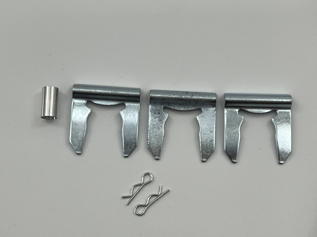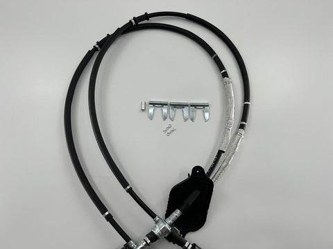 The cable set is sold complete with all hardware for installation. This includes 2 reusable hairpin style cotter pins for all cable end connections, and 3 cable retaining clips. Note that 1 of the connections uses a self-locking setup on the shifter side.