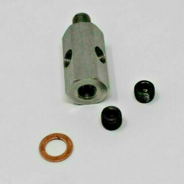 One universal 1/8" BSPT Tee for taping into OE oil pressure sender to allow for turbo oil supply or aftermarket oil pressure gauge. This handy fitting allows taps the uncommon 1/8" BSPT sensors and provide a much more common 1/8" NPT outlet for your turbo oil supply line or aftermarket gauge.