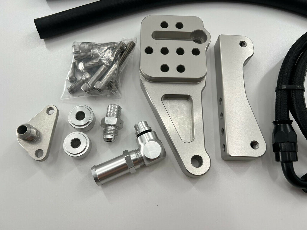 This kit will require the removal of the AC. It includes the relocation bracket, -6AN (for 02-04 RSX) or -8AN (for 05-06 RSX) fitting for the power steering pump, new swivel overflow fitting for the pump, AN fitting for the rack, high-pressure hose, and 18" of hose for the overflow bottle and cooler, as well as all needed clamps and hardware. If you are using this on a k-swap car you may need to source your own 3/8 high-pressure hose for the return from the rack to the overflow bottle.
