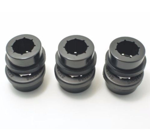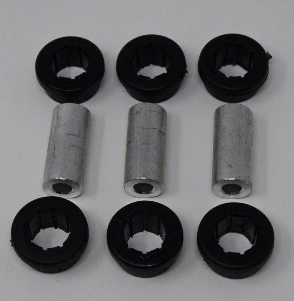 These polyurethane bushings act as bearings for quicker response and a more positive feel when compared to other manufacturers' bushings. Tearing and unseating problems normally associated with other fixed rubber bushings are eliminated by allowing the arm to rotate freely about the bushings. Fewer grooves within the inner diameter as well as special, radiused backsides help them last longer and avoid tearing and unseating. Thanks to the new design, bushing failures have been eliminated.