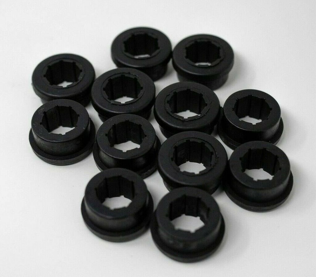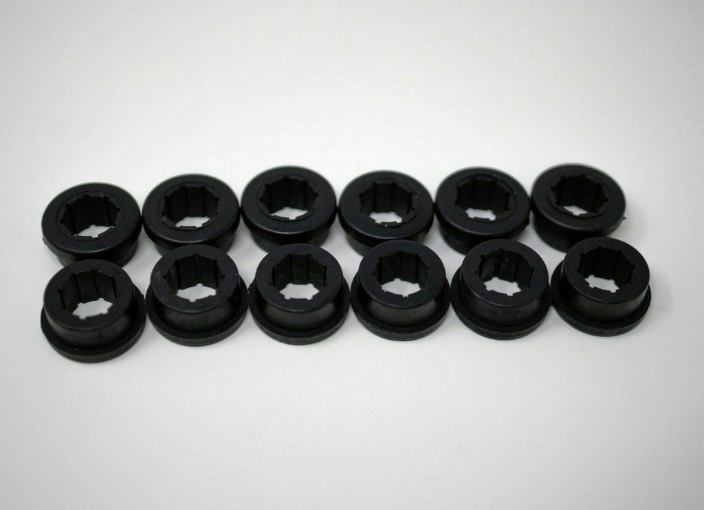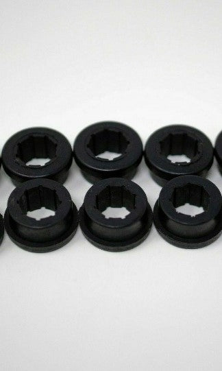 These polyurethane bushings act as bearings for quicker response and a more positive feel when compared to other manufacturers' bushings. Tearing and unseating problems normally associated with other fixed rubber bushings are eliminated by allowing the arm to rotate freely about the bushings. Fewer grooves within the inner diameter as well as special, radiused backsides help them last longer and avoid tearing and unseating. Thanks to the new design, bushing failures have been eliminated.