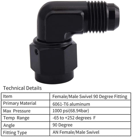 - The female/male swivel fittings are made of lightweight aluminum alloy 6061-T6 material for strong strength and good durability. Black anodized for great appearance and anti-corrosion, superior thread strength. Max Pressure: 1000psi. Working Temperature Range: -65℉ to 252℉ (-53℃ to 122℃). Can be suitable for competition applications where reduced weight is needed.