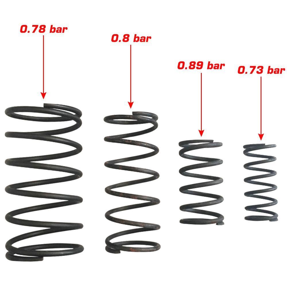 - Comes with multiple sized springs and two preinstalled. From big to small in size, the four springs are 0.78 bar/ 0.80 bar/ 0.89 bar/ 0.73 bar (1 bar=14.5 psi).