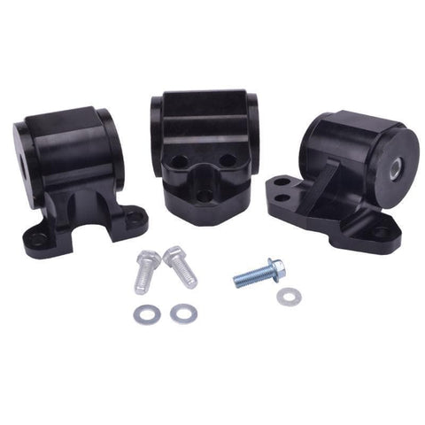 Our engine mount kit is designed to produce crisper gear shifts by preventing the front end of the engine from pitching up or down, forward, and back. Improves traction and reduces wheel hop. All engine mounts are made of high-grade billet aluminum material, urethane bushings, and steel pins. This mount kit is a direct replacement of the OEM mounts especially the liquid-filled engine mount, which tends to fail even on completely stock Civics.