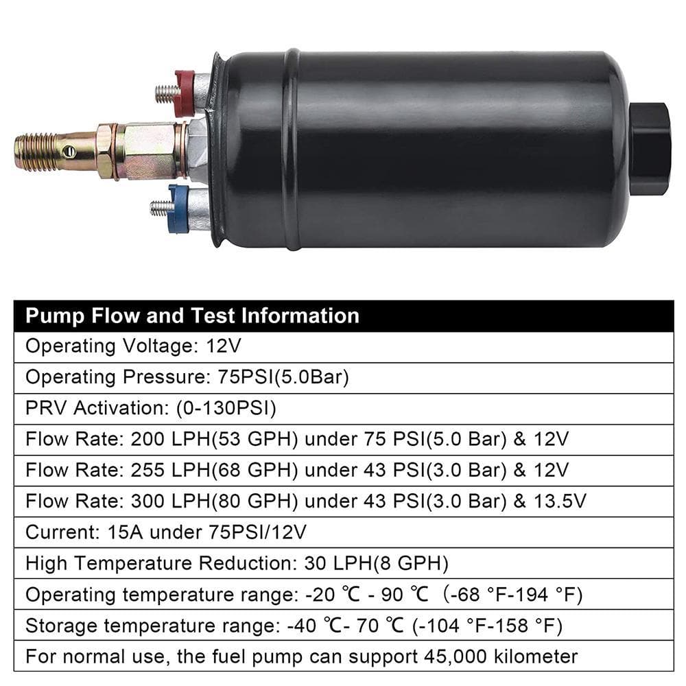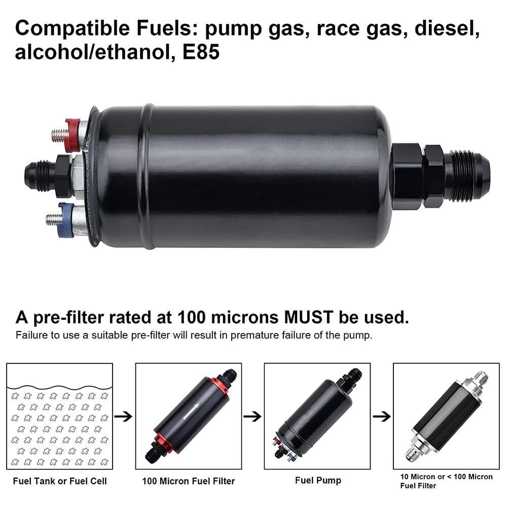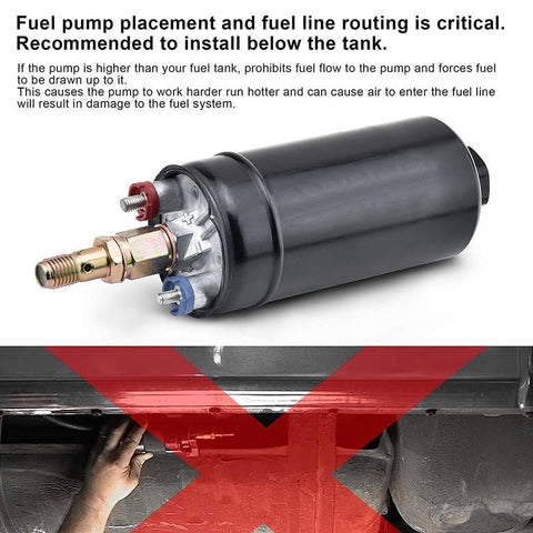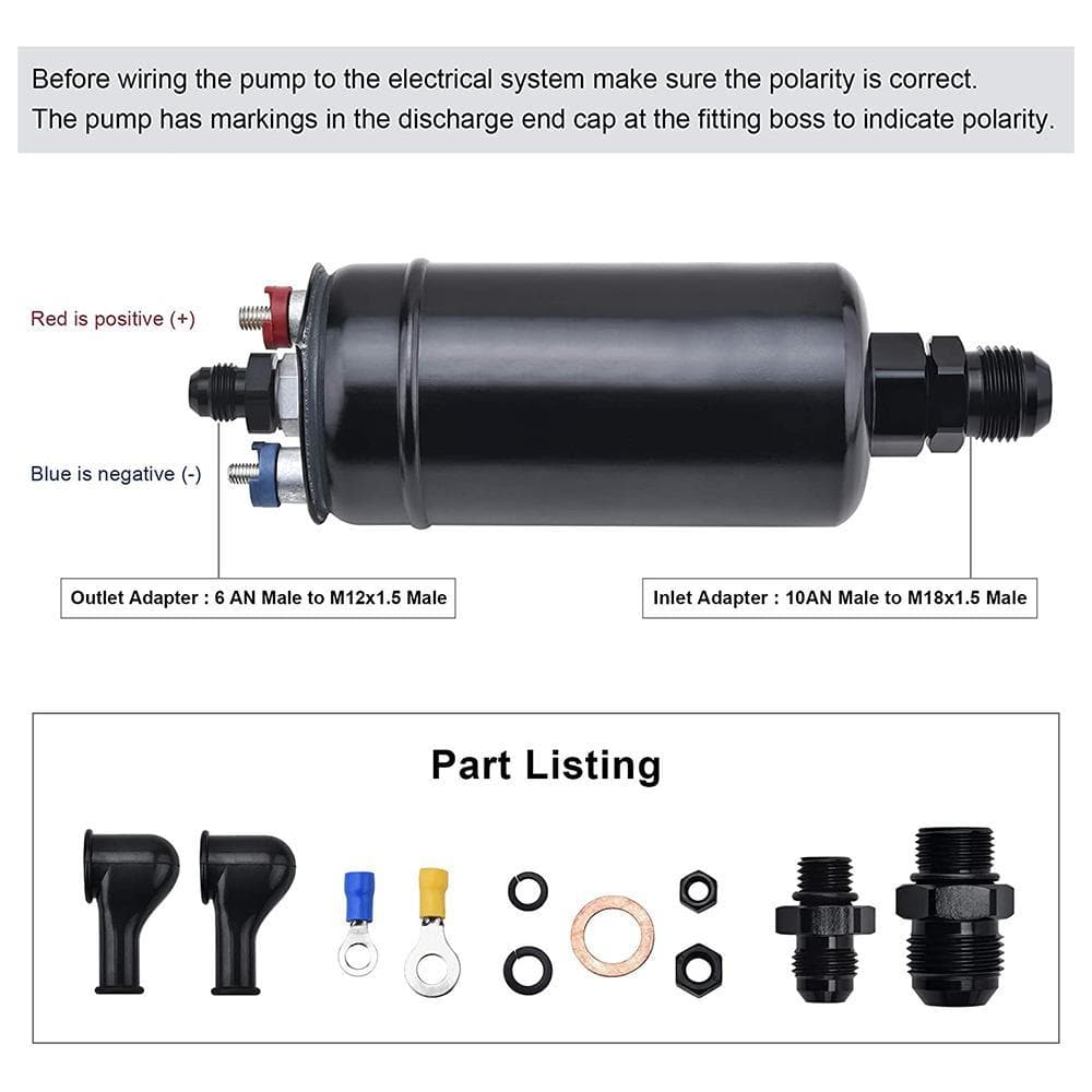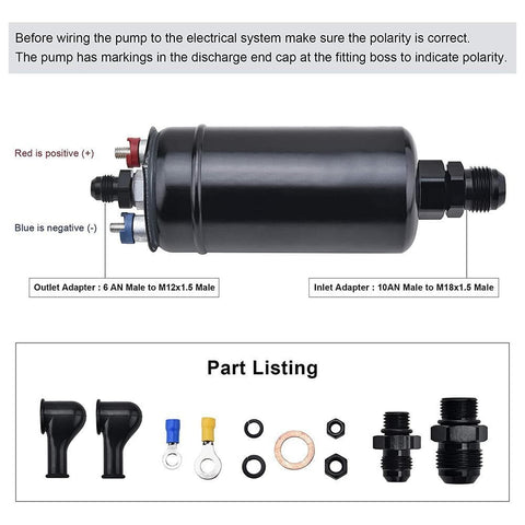 Notice: fuel pump only fit 12-volt DC batteries car. This fuel pump is intended for electronic fuel injection systems only. It is not suitable for carbureted engines. Before starting the engine, ensure there are no leaks at any point in the fuel system. Before wiring the pump to the electrical system make sure the polarity is correct.