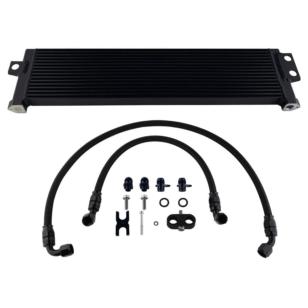 made sure to beef up the oil cooler design with this performance oil cooler. ditched the lightweight design for a full aluminum, TIG-welded bar-and-plate cooler for added strength and cooling. The bars and plates are a much more robust form of heat exchanger core construction intended for improved heat transfer and have the strength to shrug off potential road debris, keeping your oil temps down, and where it should be. Also, 10mm was added to the core’s thickness, equating in a 46% increase in core volume and increased the oil capacity by .4 qt.