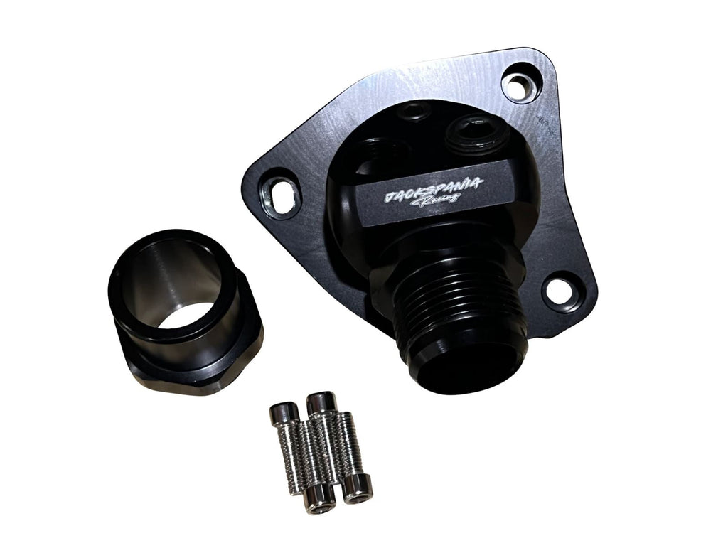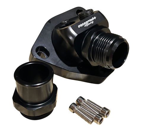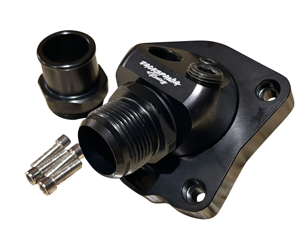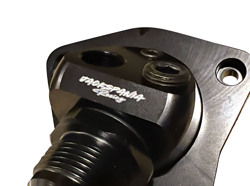 - Last but not least, this was a bonus we found while designing it. We noticed that by adding one more hole to the flange you could completely remove the oem black plastic housing from the block and the heater core hoses. When set up this way, our thermostat housing is bolted directly to the oem aluminum water pump housing. This is perfect for race car applications.
